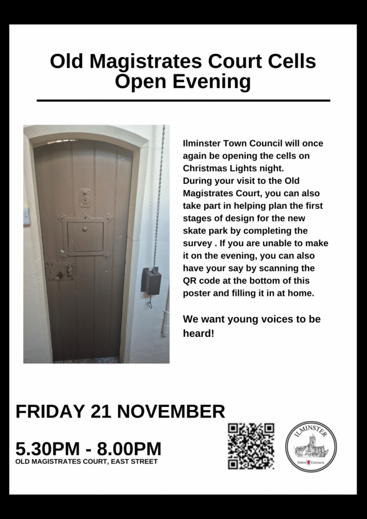 Ilminster Town Council will once again be opening the Old Victorian Cells for you to come and look at at the Christmas Lights Festival on Friday 21 November 2025. We will also be asking you to take part in our skatepark survey, to have your say on how you think the new design should look and also, there will be an opportunity to shape ideas for future youth provision.